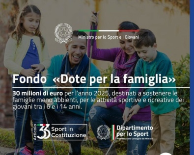 Stanziato un fondo da 30 milioni di euro per il 2025, dedicato a incentivare l’attività motoria e uno stile di vita sano: con il FONDO DOTE FAMIGLIA viene garantito ai minori in condizioni non agiate l’accesso alla pratica sportiva, supportando le ASD, SSD, ETS e ONLUS di ambito sportivo con un contributo fino a 300 € per beneficiario.